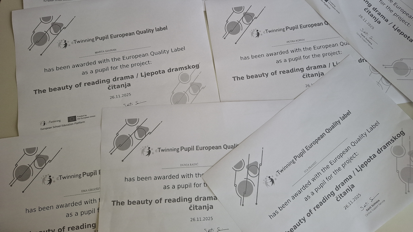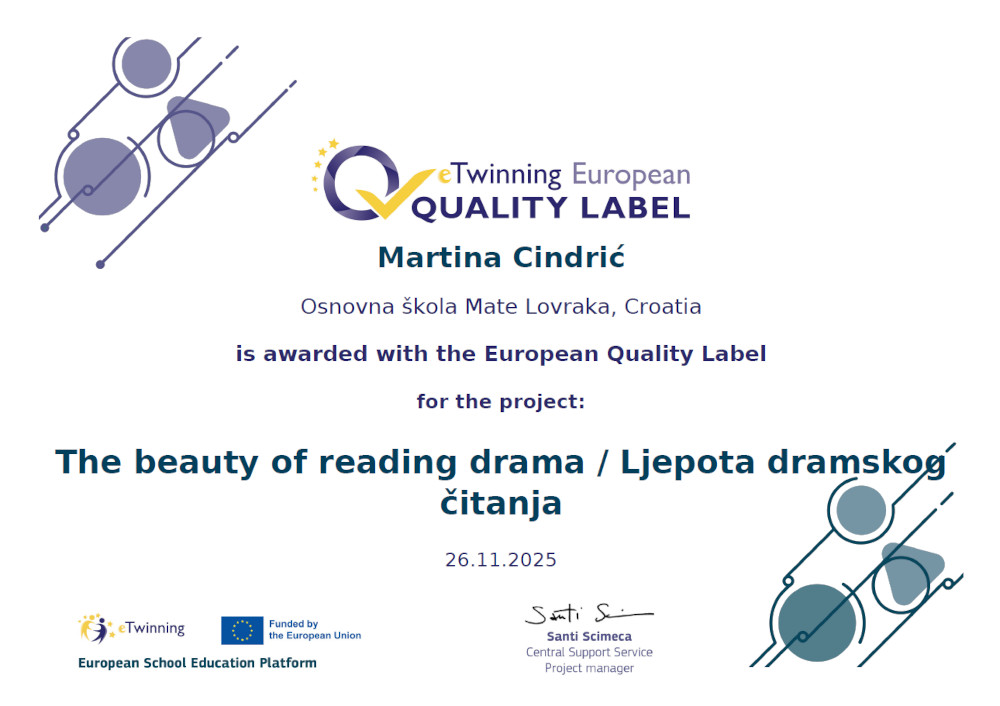 U našu školu krajem studenoga stigla je Europska oznaka kvalitete za izuzetno uspješno i kvalitetno proveden međunarodni eTwinning projekt The Beauty of Reading Drama. Projekt je proveden u protekloj školskoj godini s učenicima 2. razreda, a voditeljica projekta bila je učiteljica Martina Cindrić.