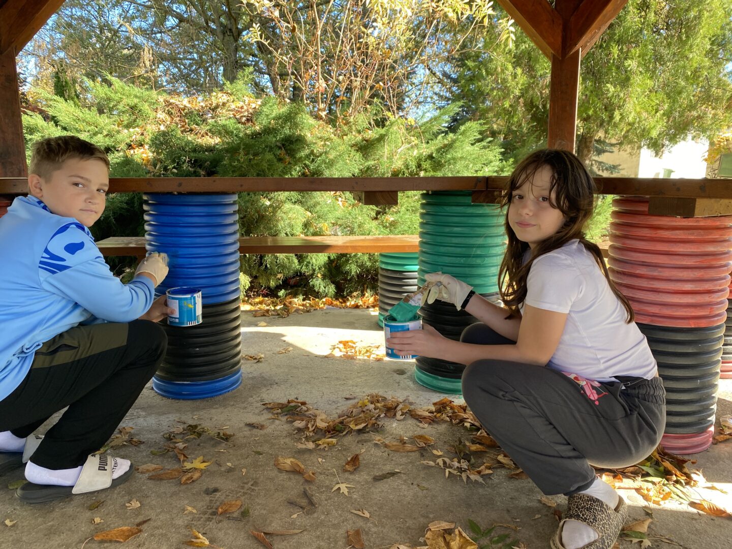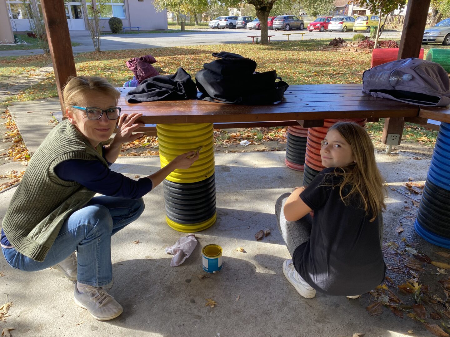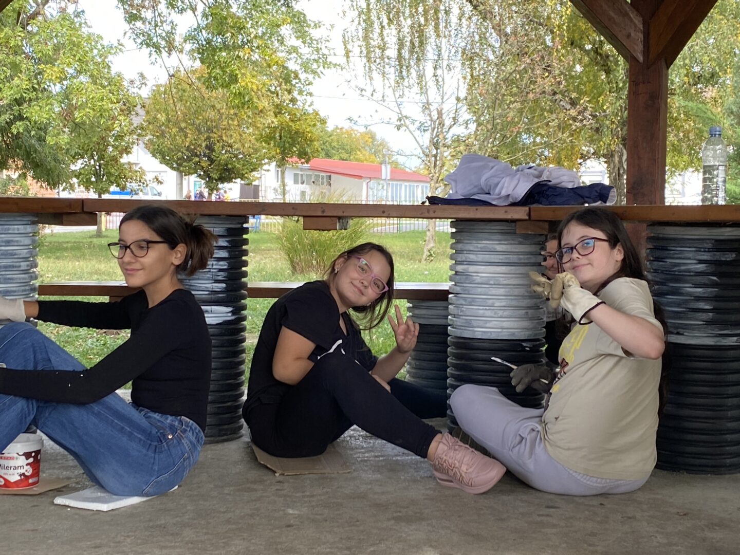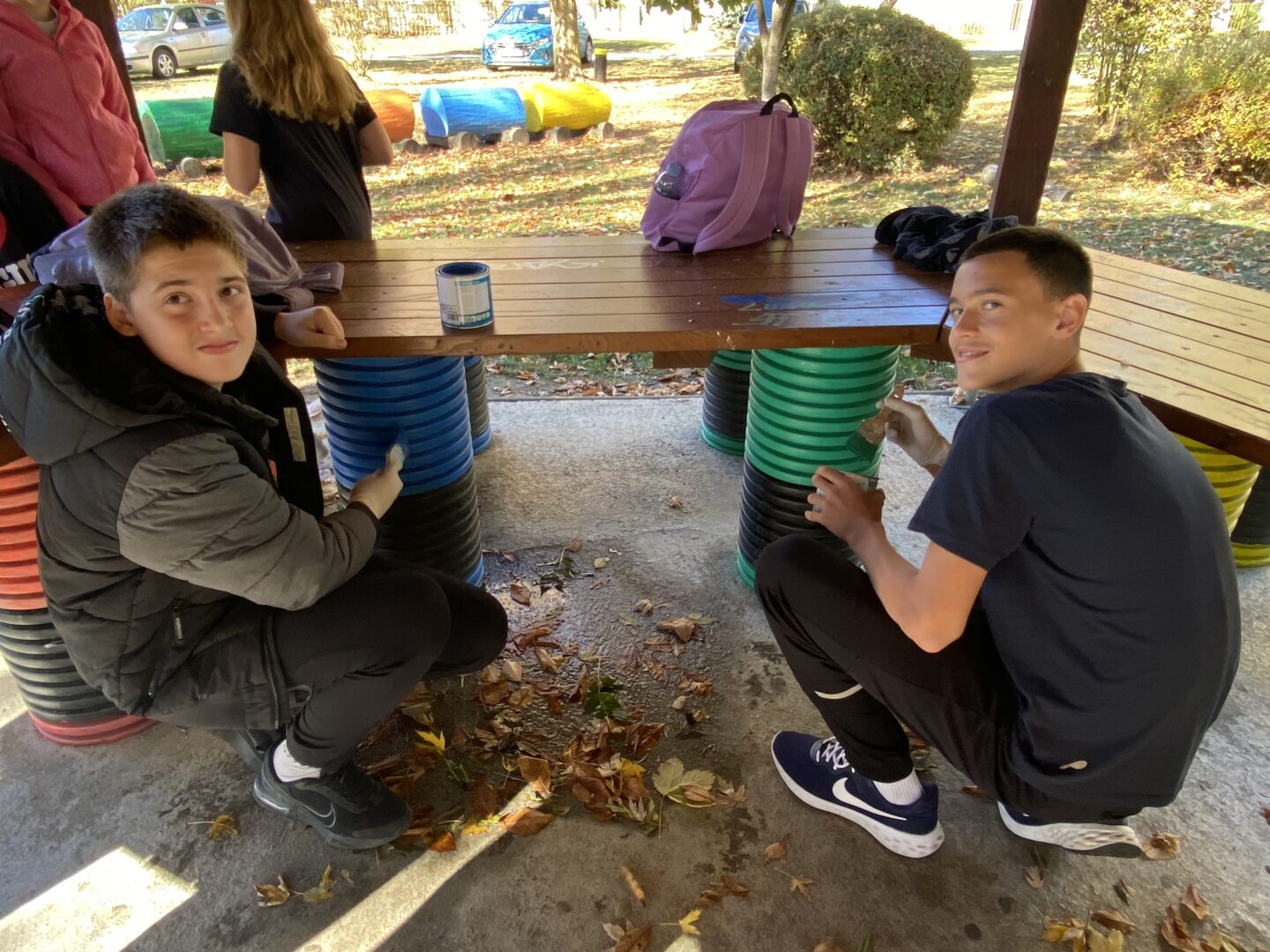 Polaznici kreativne radionice uvijek nađu dobar razlog da borave u školskom dvorištu — da budu kreativni, vrijedni, ekonomični i, najvažnije, radosni! Ovoga puta naš je cilj bio udahnuti novi život crnim plastičnim držačima stolova u sjenici, koji su godinama strpljivo služili, ali izgubili svoj prvotni sjaj.